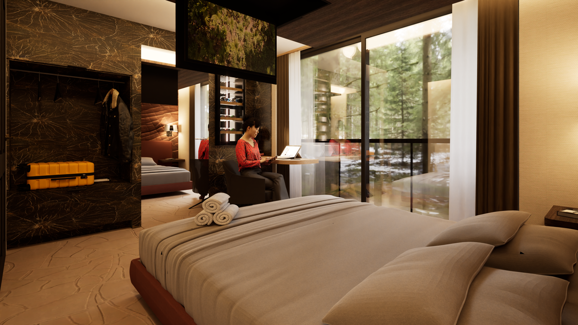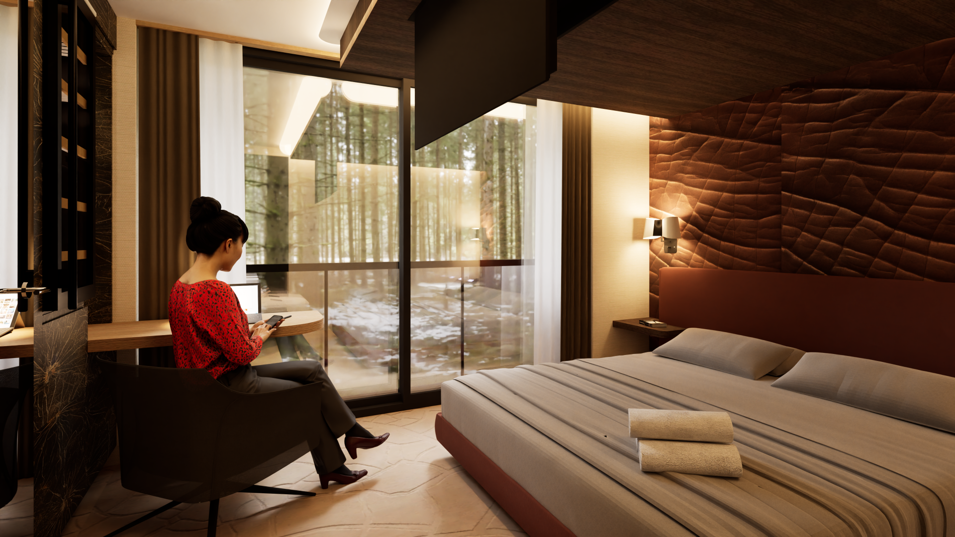 Le choix de matériaux nobles et d’accessoires soigneusement sélectionnés répond aux exigences d’un hôtel haut de gamme, tandis que l’ambiance forestière apporte une atmosphère chaleureuse, apaisante et immersive.